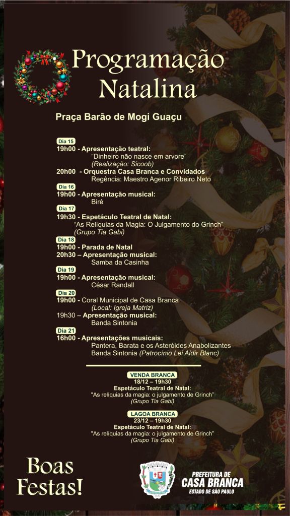 De 15 a 21 de dezembro, a Prefeitura de Casa Branca promove uma semana especial de eventos culturais para animar as noites natalinas. A programação inclui apresentações na Praça Barão de Mogi Guaçu (Praça da Matriz) e também nos distritos de Lagoa e Venda Branca. Confira a programação completa e venha viver a magia do Natal em nossa cidade!