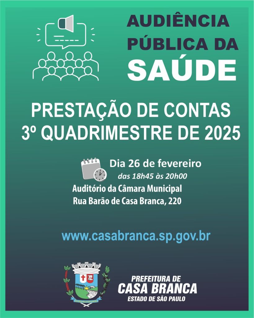 A Prefeitura de Casa Branca, por meio da Secretaria de Saúde, realizará a Audiência Pública de Prestação de Contas referente ao 3º Quadrimestre de 2025.