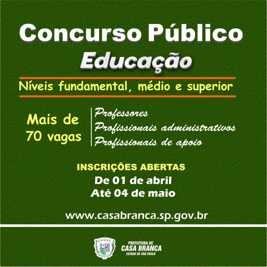A Prefeitura de Casa Branca abre a partir de 1º de abril até 4 de maio, as inscrições para o concurso público 001/2026, que visa compor o quadro da Secretaria da Educação. As vagas são para níveis fundamental, médio e superior, para professores, profissionais administrativos e profissionais de apoio operacional.