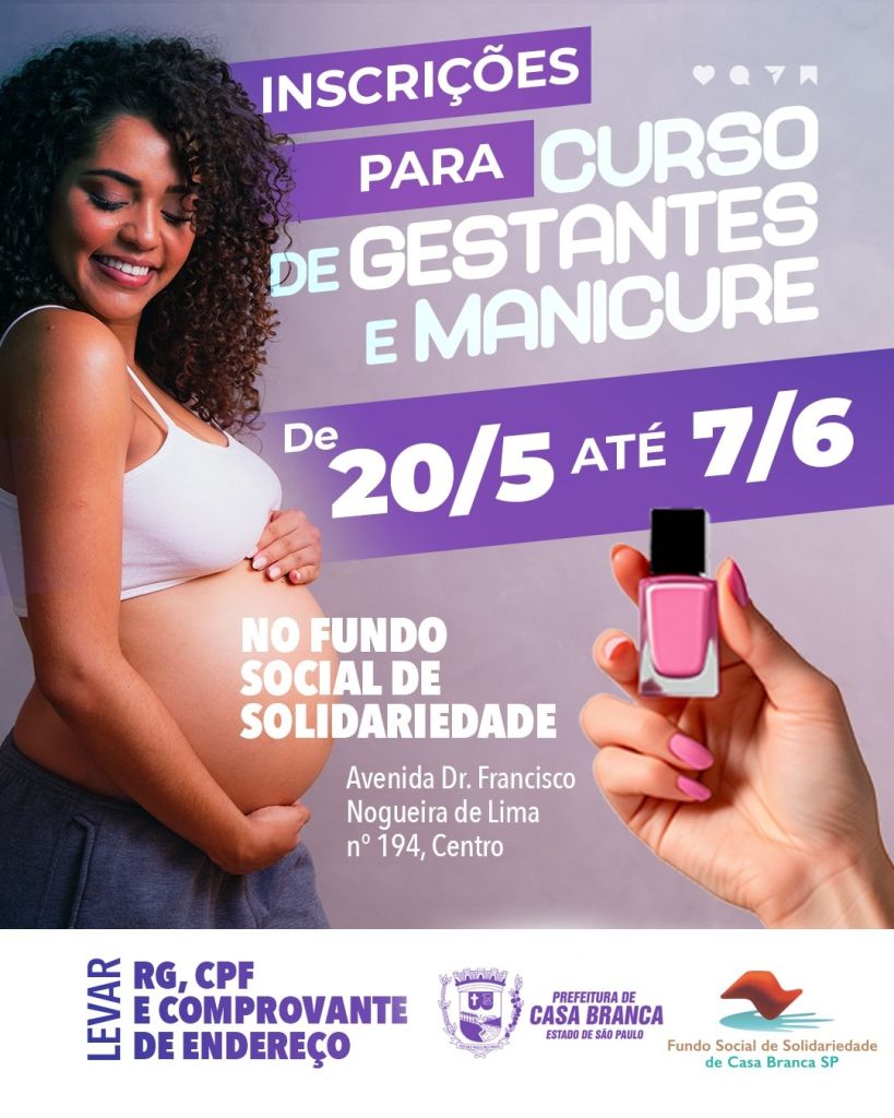 OPORTUNIDADE Atenção futuras mães e pessoas interessadas em se capacitar profissionalmente! O Fundo Social de Solidariedade de Casa Branca informa que esta é a última semana para as inscrições ao CURSO DE GESTANTES e CURSO DE MANICURE. O prazo termina n