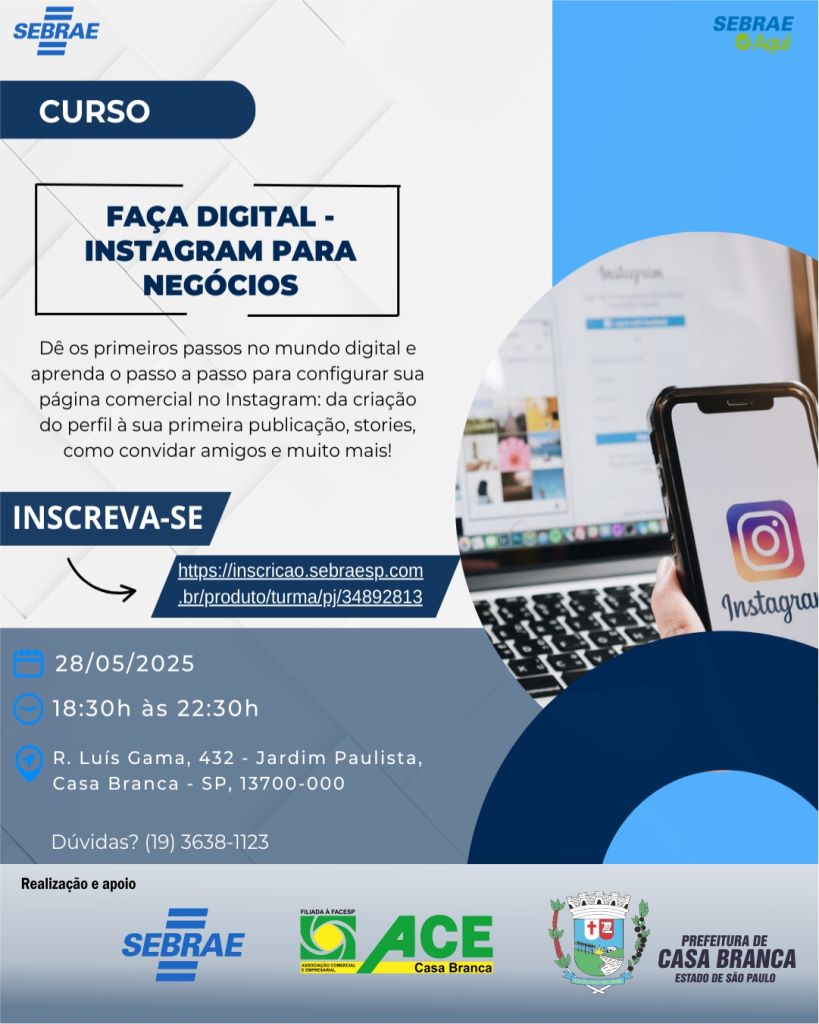 Para marcar a Semana do Microempreendedor Individual (MEI), que acontece de 26 a 30 de maio de 2025, o Sebrae, Prefeitura de Casa Branca e Associação Comercial e Empresarial- ACE, promovem três palestras gratuitas e abertas ao público, orientando os microempreendedores a utilizarem as ferramentas digitais para alavancar a atividade comercial.