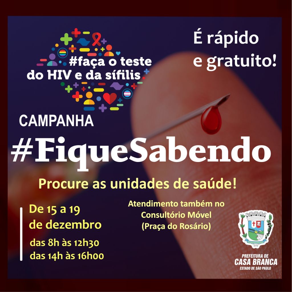 A Secretaria Municipal de Saúde realiza, entre os dias 15 e 19 de dezembro, uma grande ação da Campanha Fique Sabendo. Durante toda a semana, todas as unidades de saúde do município estarão oferecendo testes gratuitos para diagnóstico de HIV/Aids e sífilis, infecções sexualmente transmissíveis que, quando identificadas precocemente, podem ser tratadas com eficácia.