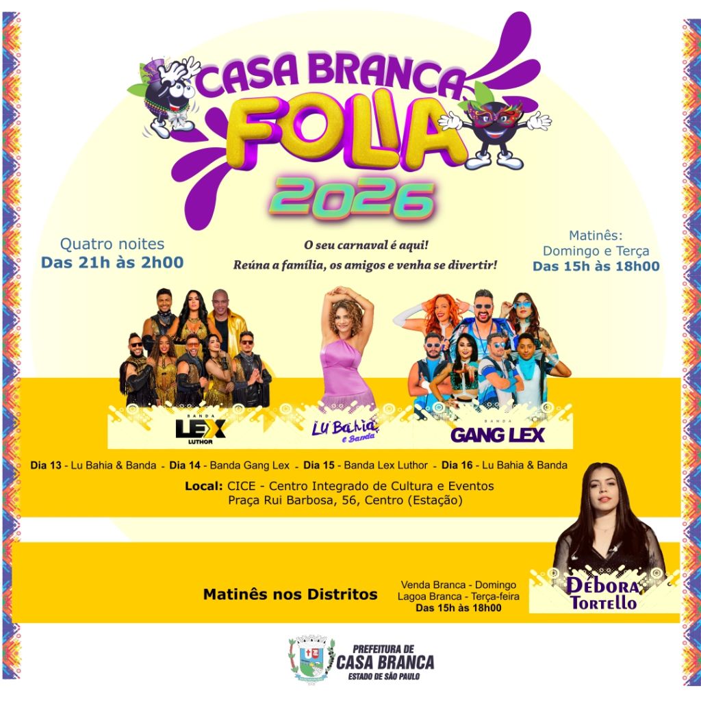 Prepare a fantasia, chame os amigos e venha curtir o Casa Branca Folia!