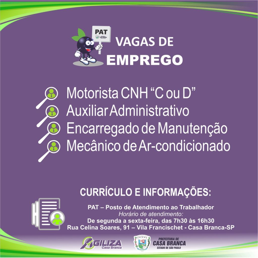 As pessoas interessadas devem se dirigir ao PAT – Posto de Atendimento ao Trabalhador, de segunda a sexta-feira, das 7h30 às 16h30, junto ao AGILIZA CASA BRANCA.